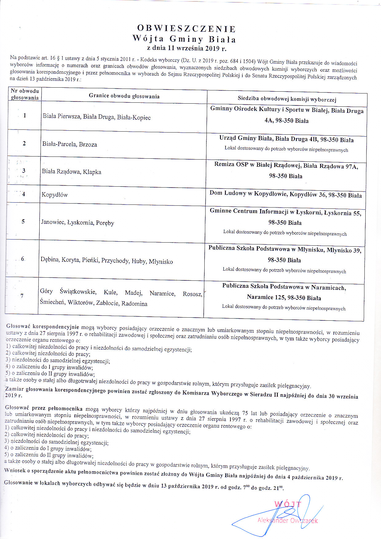 w sprawie wyznaczenia na obszarze Gminy Biała miejsc przeznaczonych na bezpłatne umieszczanie urzędowych obwieszczeń wyborczych i plakatów wszystkich komitetów wvborczych w związku z wyborami do Sejmu Rzeczypospolitej Polskiej i do Senatu Rreczypospolitej Polskiej.